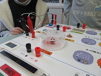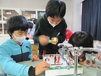 子どもたちは「手回し発電機」や「うちわで風力発電」などの、電力が「熱・光・力・音」のエネルギーに変換される装置を体験し、その仕組みを学びました。その中で「電気を熱に変える時は、たくさんの力が必要だった」と感じたことから、「ストーブや暖房はエネルギーをより多く消費する」と実生活につなげて考える姿も見られました。