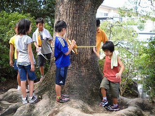 教室で予想して見当づけをしてから長さを測定する方法を用いて、子どもたちが実際に体験し、巻き尺の特徴を生かした測定ができるように指導を行いました。学校のくすの木の周りの長さや中庭の池の周囲など巻き尺でしか測れないものを測り、予想とちがったところには驚きの声をあげていました。