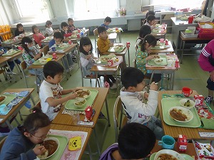 1年生の給食が4月14日(金)に始まりました。初めての給食の献立は、ビーフカレーと海草サラダ、いっきゅうづけ、牛乳でした。何もかも初めてでしたが、みんなで協力して給食の用意を行うことができました。