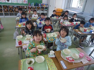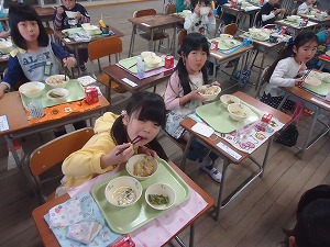 4月20日の給食の「たけのこごはん」に使っている「たけのこ」は、田辺小学校の近くに住んでおられる方がプレゼントしてくださったものです。朝堀りの新鮮なたけのこはえぐみが少なくたいへん食べやすいです。季節の味を楽しみながらおいしくいただきました。