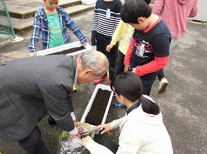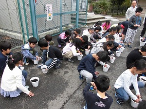 学級ごとに分かれてすいせんの球根をプランターや鉢に植えました。