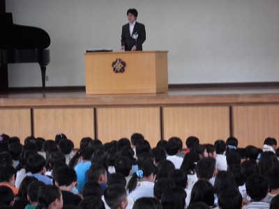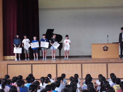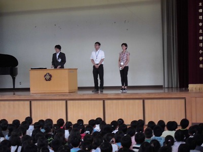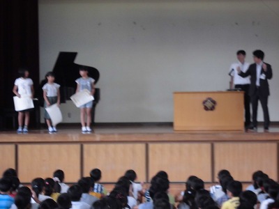始業式では、校長先生の話に続いて新しい先生の紹介・伝達表彰などが行われました。