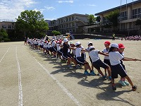 児童会種目は、1年生から6年生までの異年齢で構成されたグループが協力して、色別対抗で綱引きで対戦します。