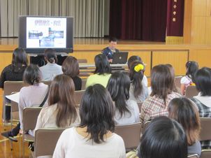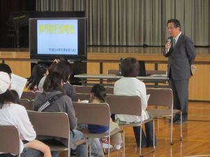 6年生の保護者対象の修学旅行説明会が体育館で行われました。