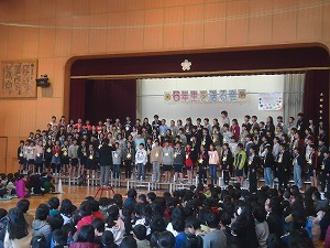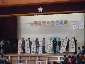 2月23日(金)の2・3時間目に6年生を送る会を行いました。この会は、卒業を迎える6年生に励ましと感謝の気持ちを伝え、楽しい思い出作りをするとともに、児童会活動を引き継ぐ場としています。