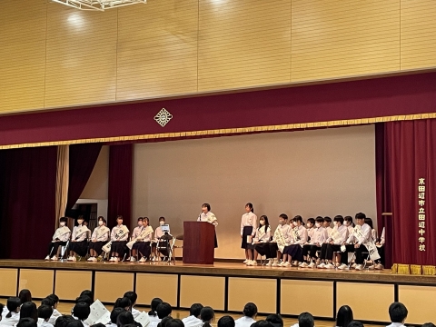 新入生誓いの言葉では、田辺中学校の目指す生徒像「知性・情操・健康・友愛」に近づく努力をしていきます、という力強い宣言をしていました。