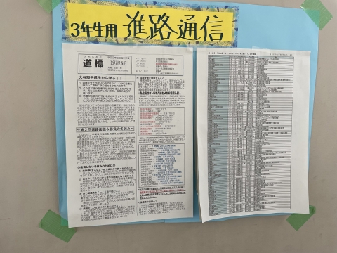 また3年生用に配布されている「進路通信」。進学主任が作成している通信ですが、これも拡大して掲示されています。
