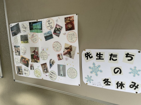 1年生の掲示板には、先生方の冬休みの過ごし方が書かれていました。