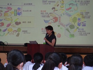 本日2年生では、同志社女子大学の生活科学部食物栄養科学科の教授、学生さんに来ていただき、「食に関する教育」(食育)を行いました。