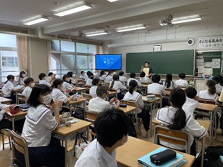 生命のはじまり、出産の様子、子育て経験者の話、妊婦エプロンをつけての妊婦体験、赤ちゃんの抱き方体験など盛りだくさんの内容でした。将来親となる中学生たちが、生命の素晴らしさや子育てに関する理解と関心を持ち、今後の自分の生き方を考える機会になりました。
