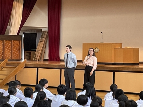 また、2学期からALTとして田辺中学校の英語教育に携わっていただく2名の先生を紹介しました。