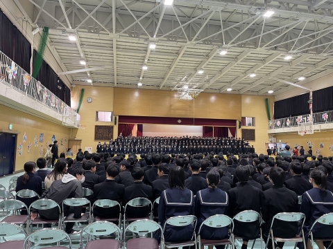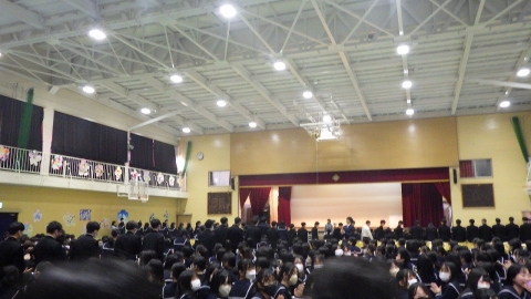 生徒のみなさんは8時50分に体育館に入り、元クラスで整列してください。卒業生のみなさんは体育館後方に並んでください。