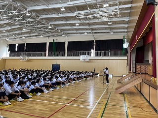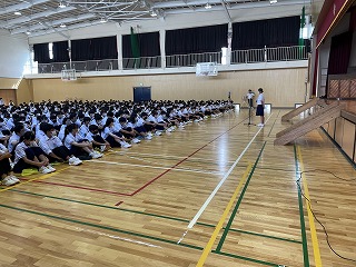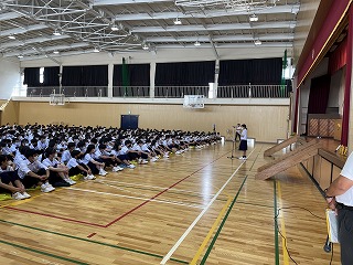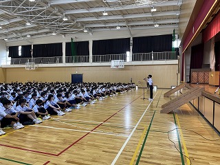 校長先生は、お話の中で、特に気を付けてほしいことは「あいさつ」だということを伝えていました。「あいさつ」は人と人をつなぐコミュニケーションツールです。武道では『礼に始まり、礼に終わる」という言葉がありますが、武道に限らず、「礼」(あいさつ)によって、相手に敬意を払うことが大切です。私たちはさまざまな人の支えがあって、生活ができています。そのことにも感謝して、「あいさつ」という行動に移してほしいと思います。また、毎朝、登校時にあいさつをしていますが、気持ちよいあいさつが自然とできる中学生になってほしいとお話していました。