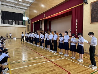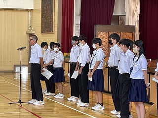 壮行会では、明日から始まる夏季大会に向けて、それぞれの部長が決意を述べていました。「頑張る」だけでなく「今までお世話になった先生や保護者の方に感謝の気持ちをもって」や「仲間との絆を信じて」など周囲の人への感謝の思いがひしひしと伝わるスピーチでした。昨年は3年生がコロナで苦しんだ分、今年は体調管理をしっかりとして悔いのない試合になるようにしてください。