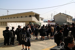 生徒のみなさんは8時50分に体育館に入り、元クラスで整列してください。卒業生のみなさんは体育館後方に並んでください。