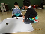 「みてみて、たくさん回っているよ!」「誰のこまが最後まで回るかな?」と自分のこまだけでなく、友達のこまがたくさん回っていることを楽しむ姿も見られました。