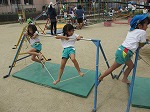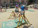 園庭の遊具や鉄棒にロープをくくりつけたり、巧技台や一本橋でコースを作ったりしてできた「あそびランド」