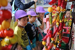 4歳児と5歳児と手をつないで棚倉孫神社に行き、瑞饋(ずいき)神輿を見せてもらいました。