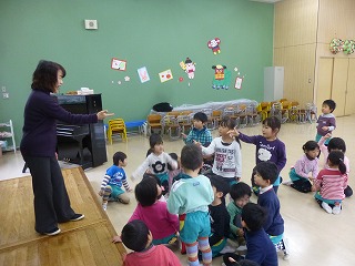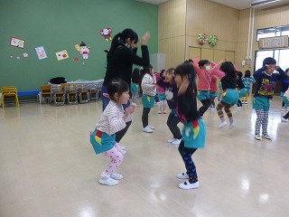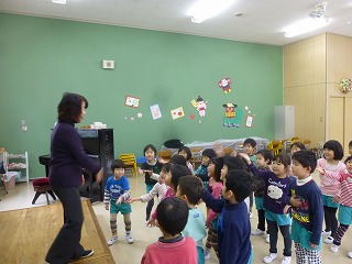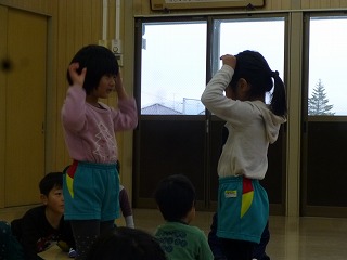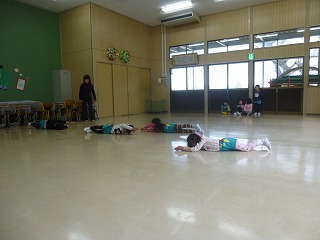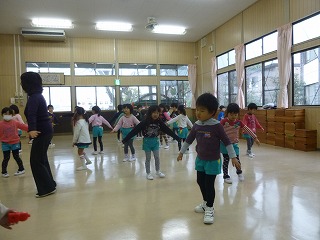 寒い時期のため、始めは「ぐるぐるめゃっこ」で体を動かしました。