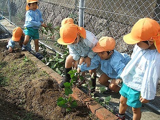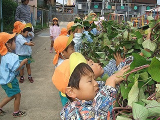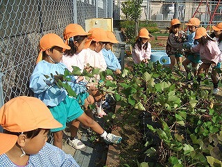 園庭にある花壇に、6月17日に「おいしいおいもができますように・・」と言いながらみんなで、おいもの苗を植えました。それから、お水をあげたり、夏の暑い中、草をひいたりお世話をしてきました。夏休み明けにおいものツルがのび、花が咲いているのをみつけて「おいもの花が咲いてるね」「もう、おいも出来てるかな?」とサツマイモの成長を見守っていました。