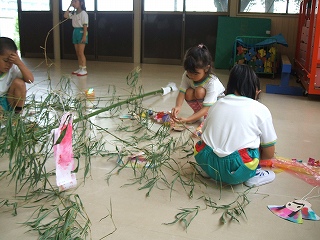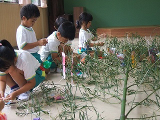 2日の日にお家の人と一緒に短冊に願い事を書いて笹に飾りました。