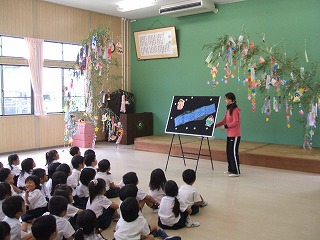 七夕の由来を聞く子供達。