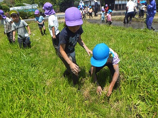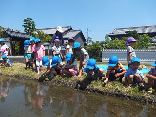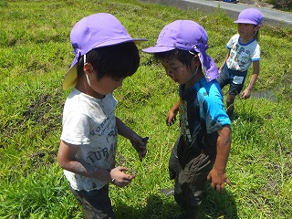 田んぼに着くと、まずは田んぼを覗き込み、あめんぼやかえる、