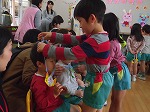 その後、3歳児が待つ保育室へ5歳児が行き、3歳児のお友達の歓迎会をしました。お兄さん・お姉さんが来てくれて嬉しそうな3歳児のお友達。一緒に歌を歌い「入園おめでとう。一緒に遊ぼうね」とペンダントを首にかけてもらいました。