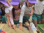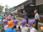 「この野菜何でしょう?」「トマトかな?」正解は”アカナス”、刀のように長い豆は”ナタマメ”など、あまり聞いたことのない野菜にびっくりする子どもたちでした。