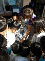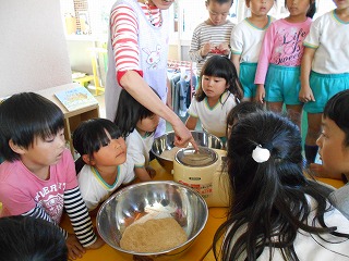 みんな茶色い玄米が白米になっていく様子に興味津々で精米器をのぞき込んでいました。