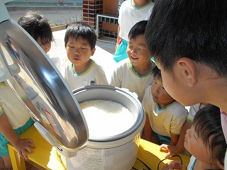 用務員さんに炊き上がりましたよ!!と教えてもらい、さっそく見に行きました。