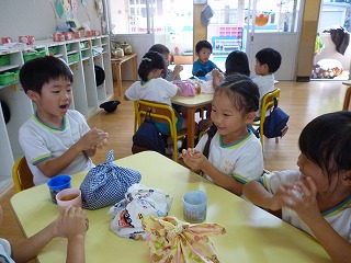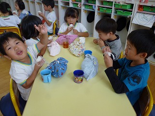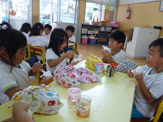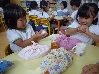 手を洗って、ラップをもらい自分たちでおにぎりにしました。
