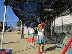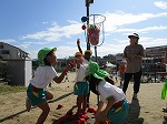 カゴめがけて玉を「エイッ!!」「入った~」と大喜び。