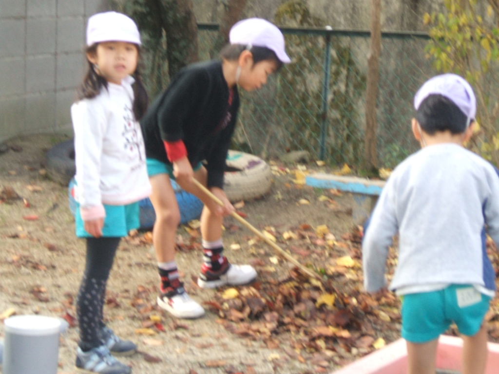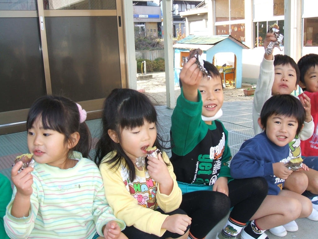 「幼稚園の庭で、落ち葉拾い」 「もう焼けたかな?」 「おいし~い!!」