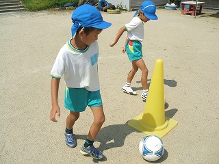 2人組になりコーンをどちらが早くまわれるか「よーい!どん!」