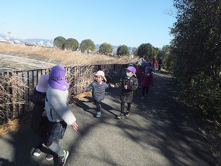 5歳児ばら組、すみれ組は、3歳児さくら組、もも組、たんぽぽ組の手を引いて