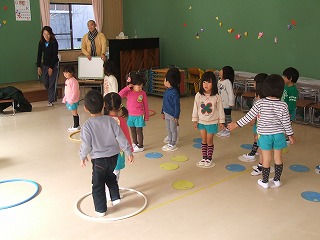 音楽に合わせて回る『ロンドン橋落ちたゲーム』をしました。捕まらないように