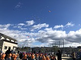 「田辺幼稚園 50歳 おめでとう!」のかけ声で、風船を放すと…