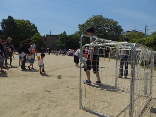 ゴールにシュート!!のコーナーでは、お家の人にキーパーになってもらってゴールを