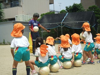 話を聞くときは、ボールのいすに座って、うまくバランスをとりながら。