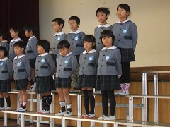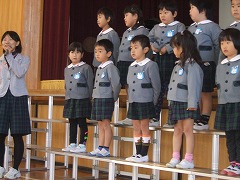 ♪園歌、♪はたけのポルカ、♪風と光とこどもたち の3曲を歌いました。