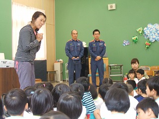 2名の消防士さんに園に来ていただき、避難訓練の様子を見ていただいたり、火や花火について話していただいたりしました。