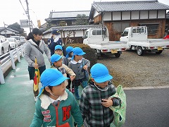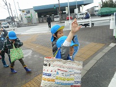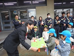 おじいちゃん、おばあちゃん、大切な人が交通事故に遭いませんように・‥と子どもたちが願いを込めてイラストやメッセージを描いた年賀状を、年長すみれ組が代表して持って行きました。