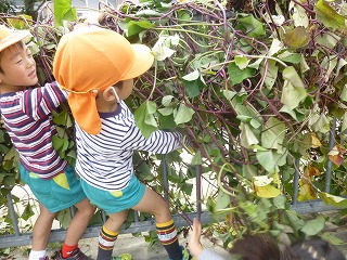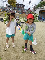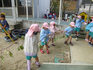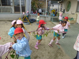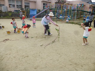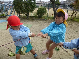 みんなでお芋を抜いたあとはいものつるで綱引きをしています。