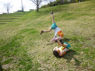 広い野原で後ろ回りと側転をする子ども達もいます。