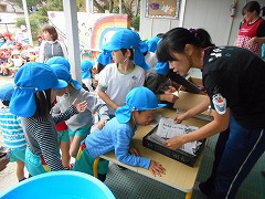 「上手にまけるかなー?」「大丈夫!!ほら見て」と得意げな年長さん。