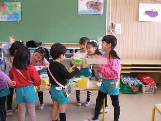 年長クラス、すみれ組、ばら組の部屋で子ども達の考えたお店屋さんが朝から開店しました。