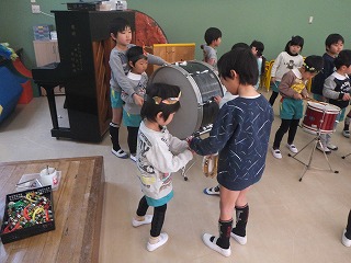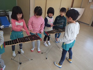 5歳児は、大太鼓や小太鼓、鉄琴や木琴などいろいろな楽器の使い方や、