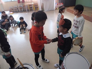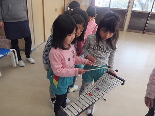 演奏の仕方を、3歳児や4歳児の子どもたちに優しく教える姿がありました。