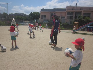 とてもおもしろいつながり隊のコーチに親しみをもち、ボールに触れることから、友達と一緒に体を動かして遊ぶ楽しさを感じることができました。